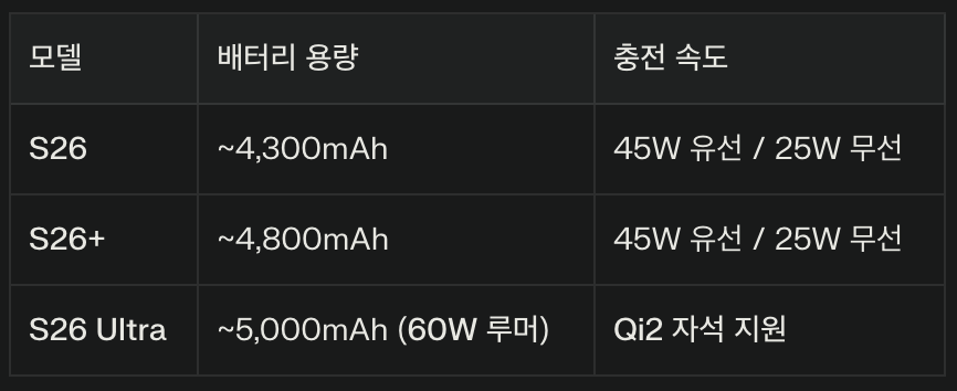 – S26 / S26+: 45W (기존 유지)