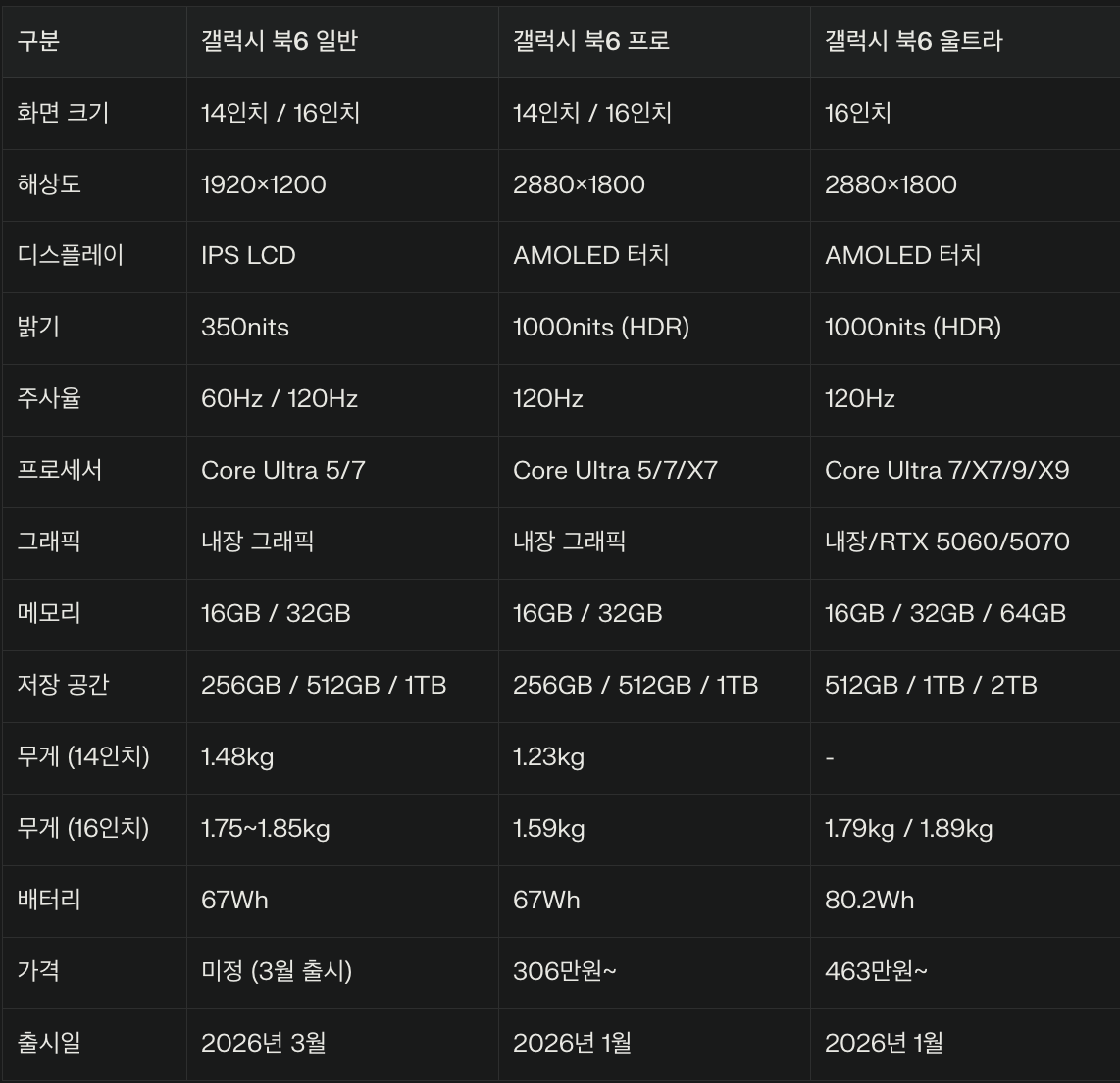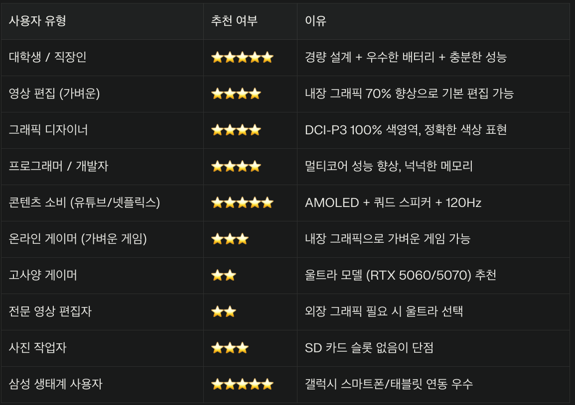 특히 외장 그래픽카드가 필요 없는 업무용, 콘텐츠 소비, 가벼운 크리에이티브 작업을 주로 하는 사용자라면 만족도가 높을 것으로 예상됩니다. 반면 무거운 게임이나 전문 영상 편집을 주로 한다면 외장 그래픽이 탑재된 갤럭시 북 6 울트라를 고려하는 것이 좋습니다.